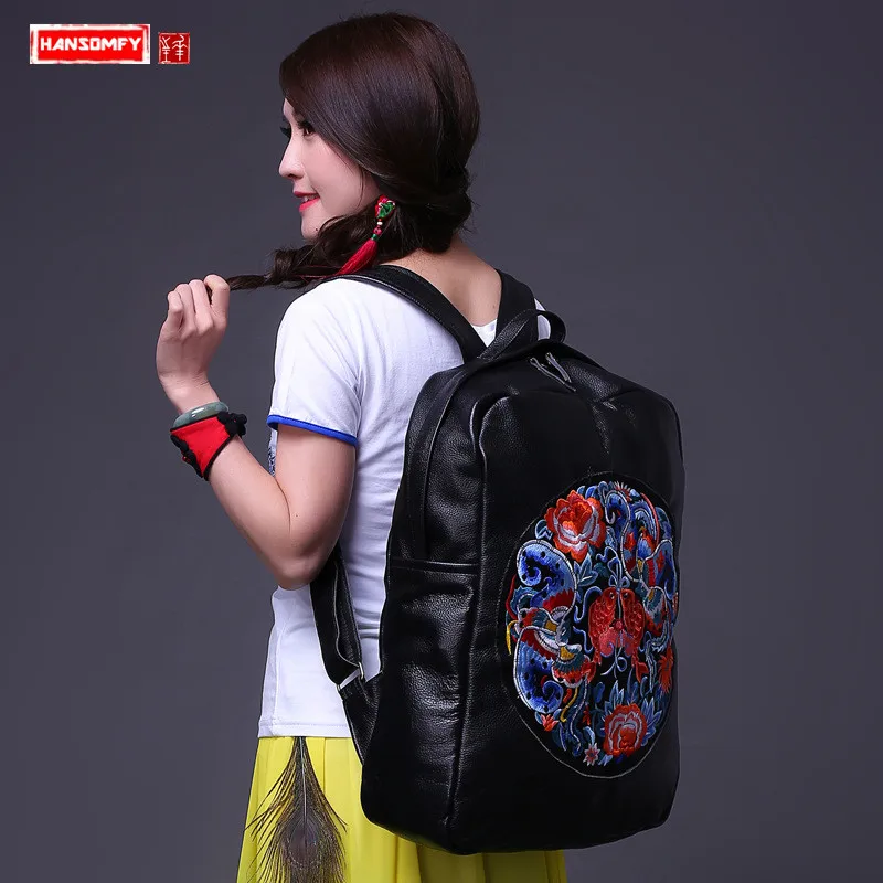 TOP 2018 new national wind Women Backpacks Genuine leather female shoulder bag large capacity embroider