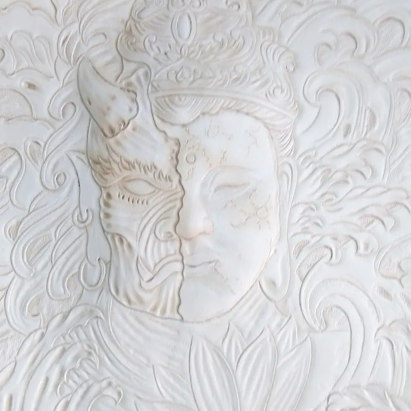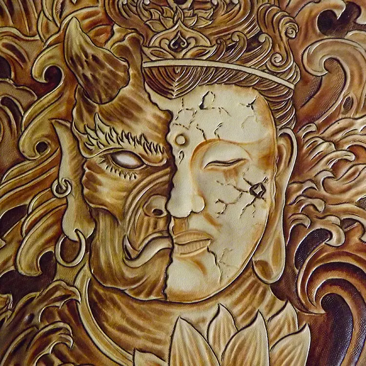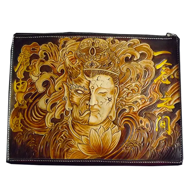Handmade Men Vegetable Tanned Leather Bag Carving Between Good And Evil Money Holder Clutch Purse P