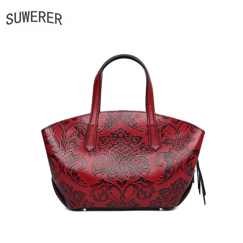 SUWERER 2019 New women genuine leather bags fashion Embossing Flowers bag cowhide luxury handbags w