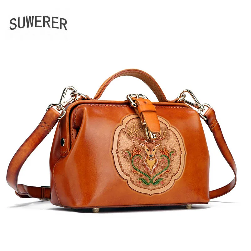 SUWERER Women Genuine Leather bag Handmade Carved top cowhide luxury fashion tote women leather bag