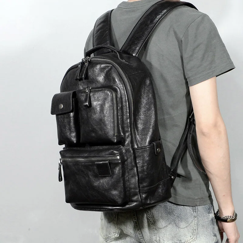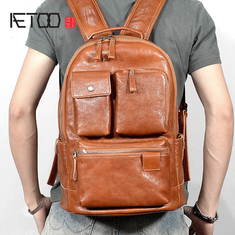AETOO Leather men's double shoulder bag casual business backpack leather travel computer bag large-