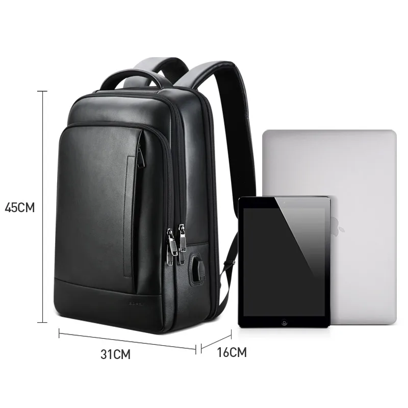 BOPAI laptop genuine leather backpack fashion business back pack male computer usb black leather ba