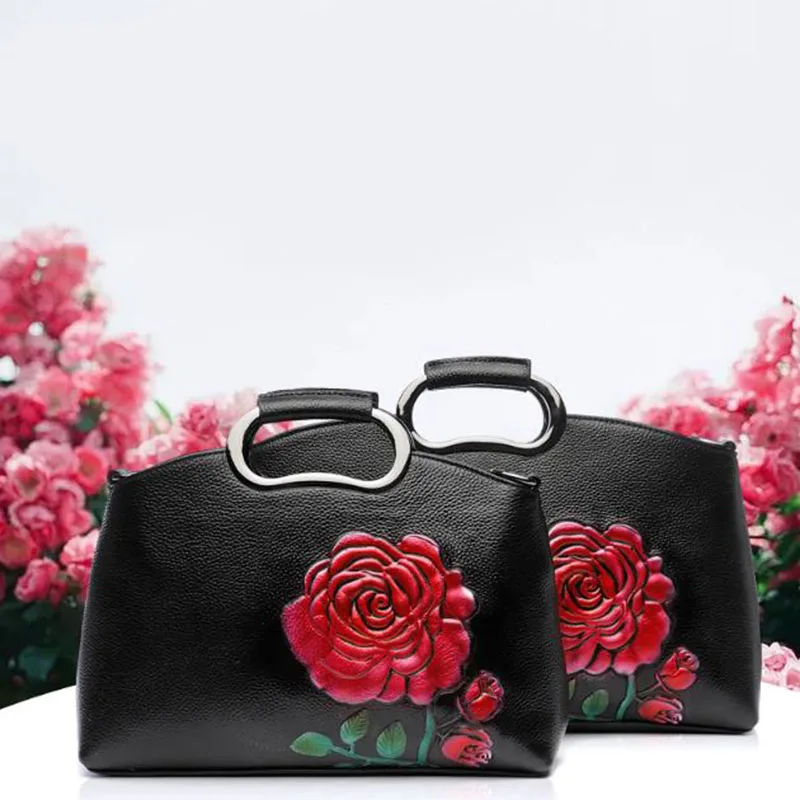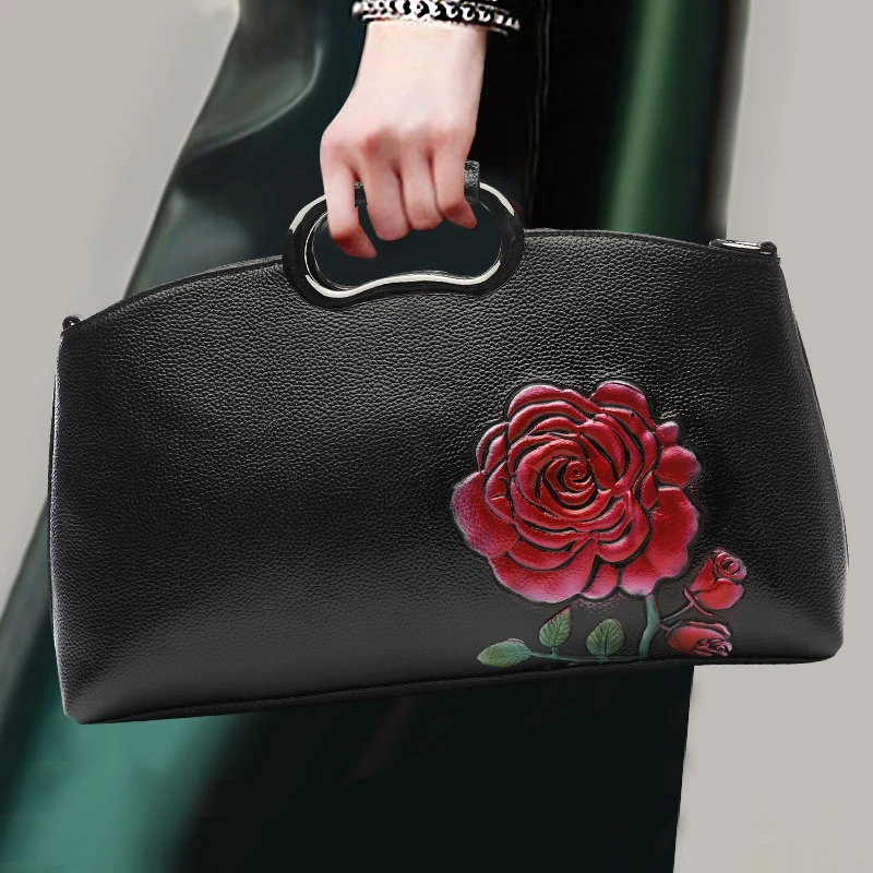Women Fashion Handbag Genuine Leather 3D Flower Pattern Top Leather Noble Party Top-handle Bag Ladi